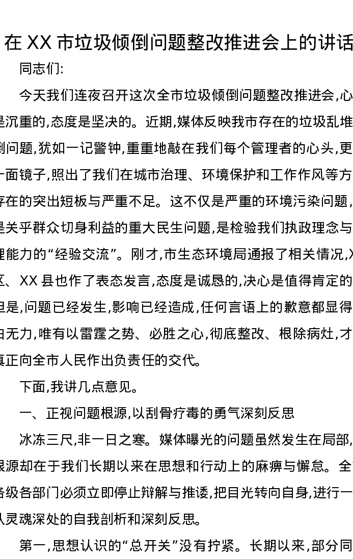 在XX市垃圾倾倒问题整改推进会上的讲话
