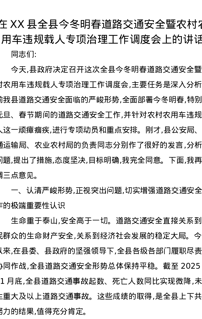 在XX县全县今冬明春道路交通安全暨农村农用车违规载人专项治理工作调度会上的讲话