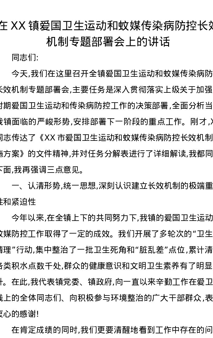 在XX镇爱国卫生运动和蚊媒传染病防控长效机制专题部署会上的讲话