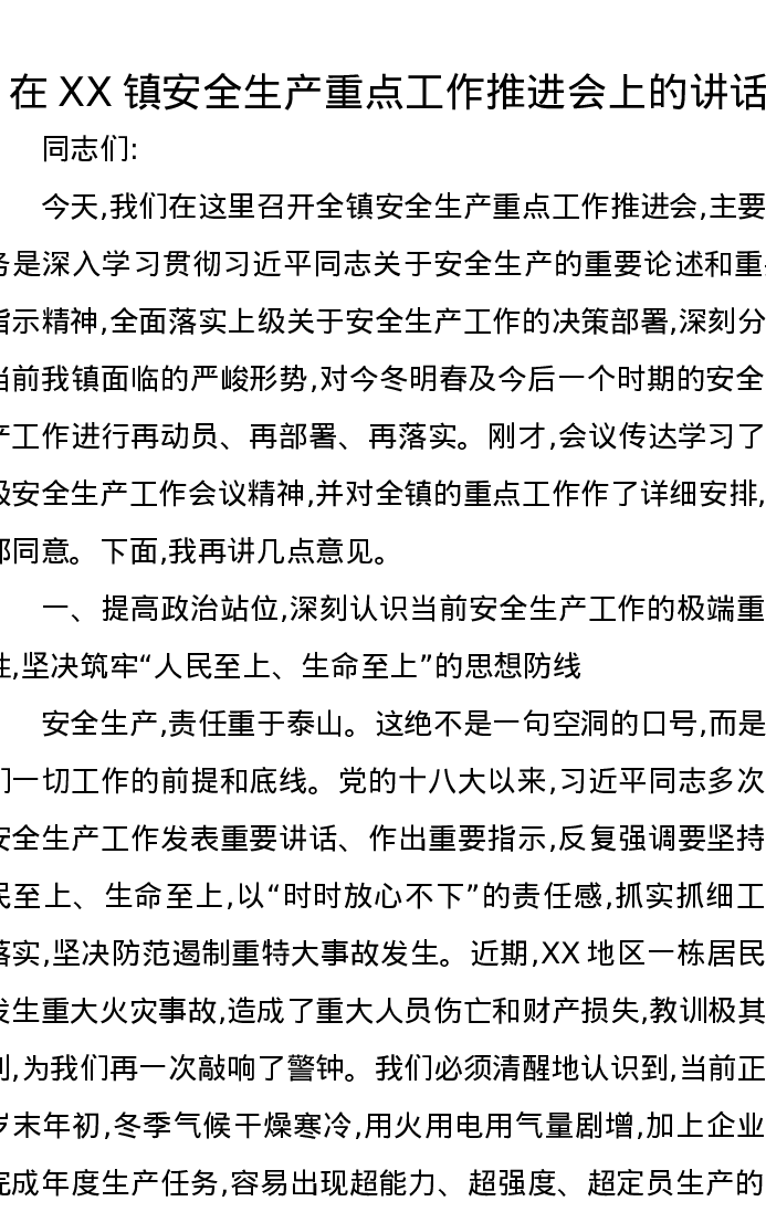 在XX镇安全生产重点工作推进会上的讲话