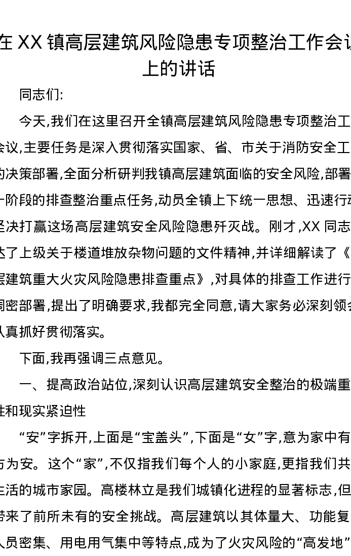 在XX镇高层建筑风险隐患专项整治工作会议上的讲话1