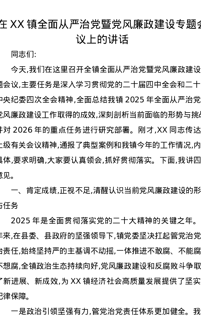 在XX镇全面从严治党暨党风廉政建设专题会议上的讲话2