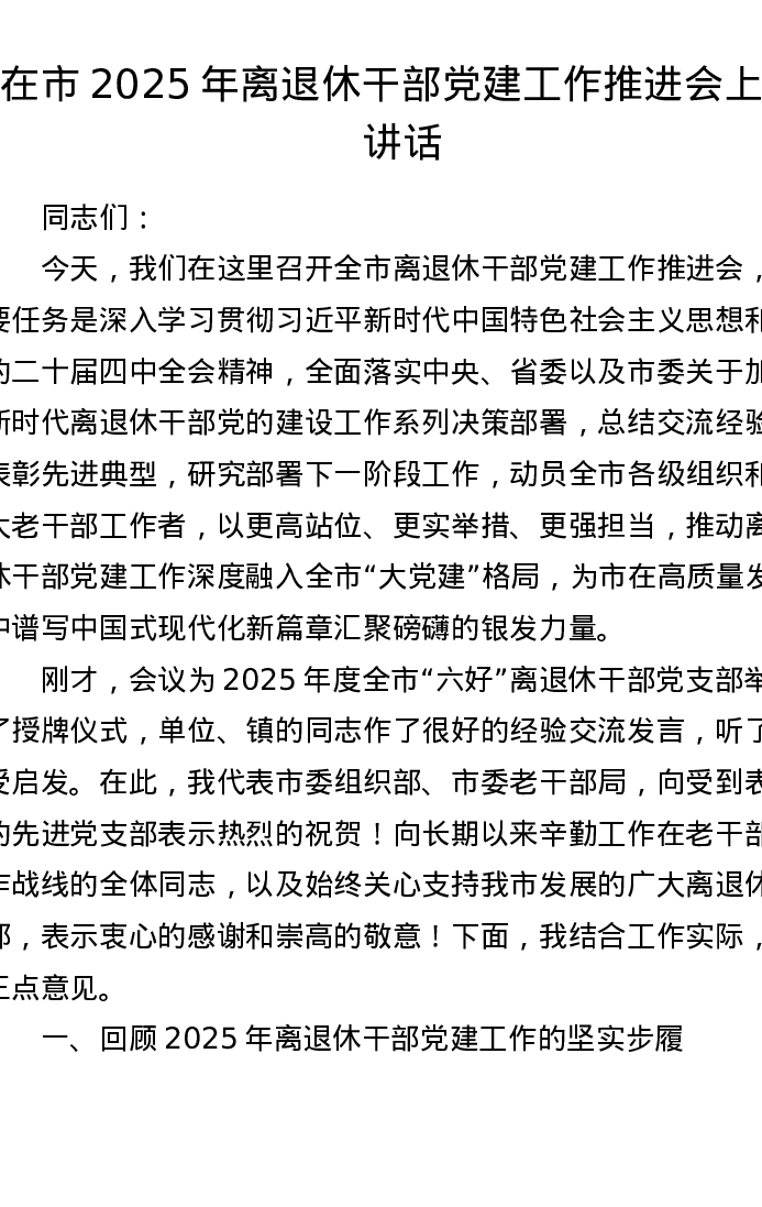 在市2025年离退休干部党建工作推进会上的讲话