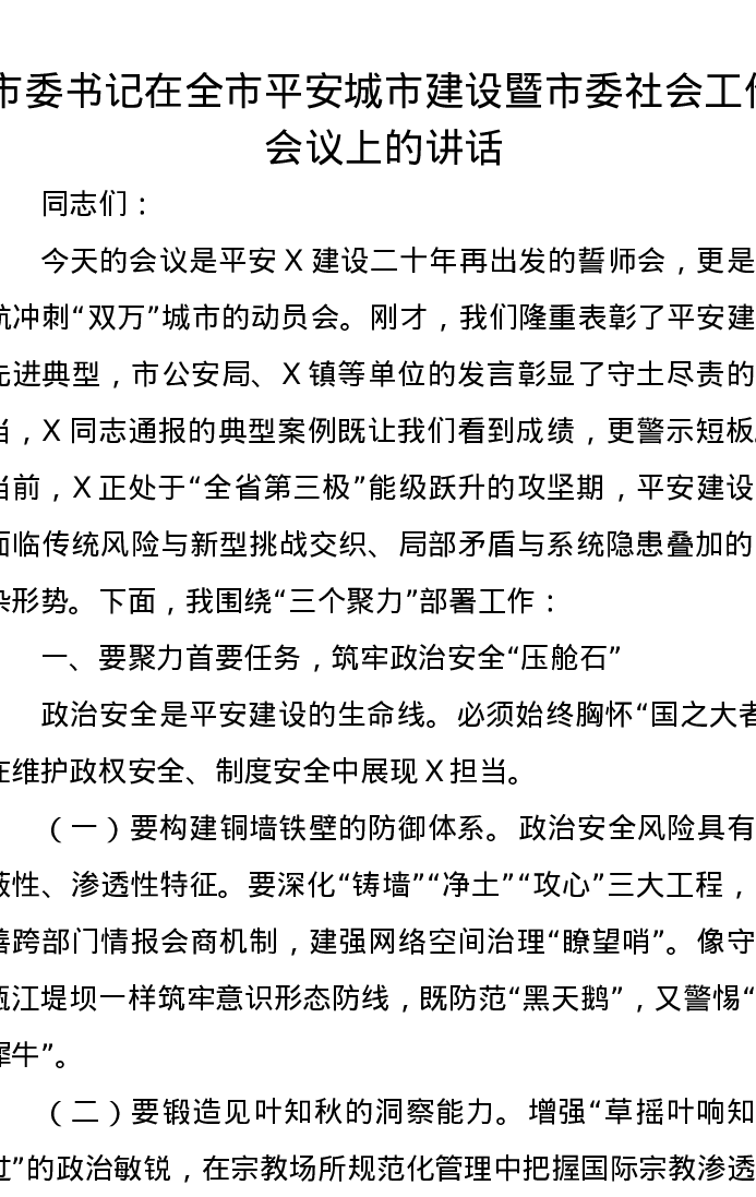 市委书记在全市平安城市建设暨市委社会工作会议上的讲话