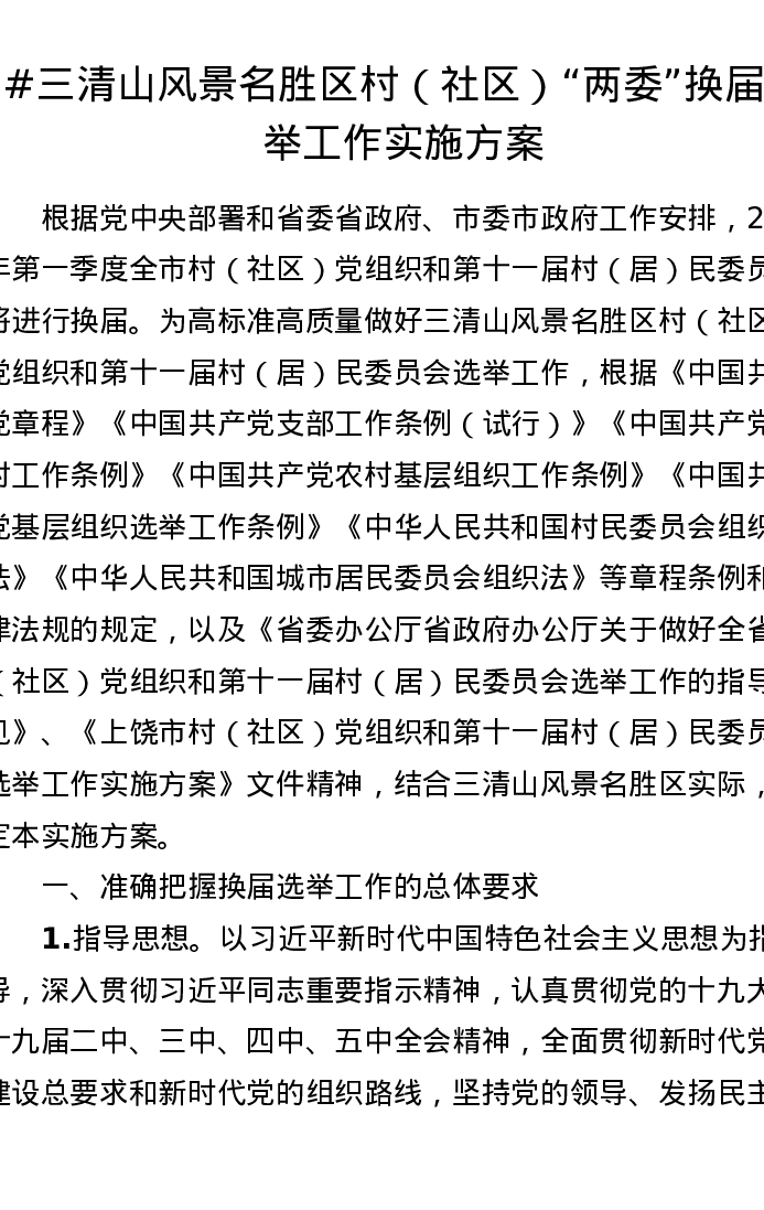 三清山风景名胜区村(社区)两委换届选举工作实施方案