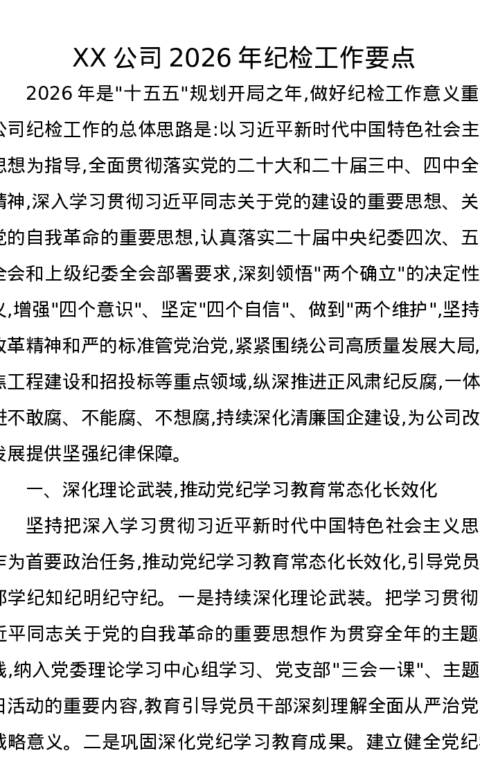 XX公司2026年纪检工作要点