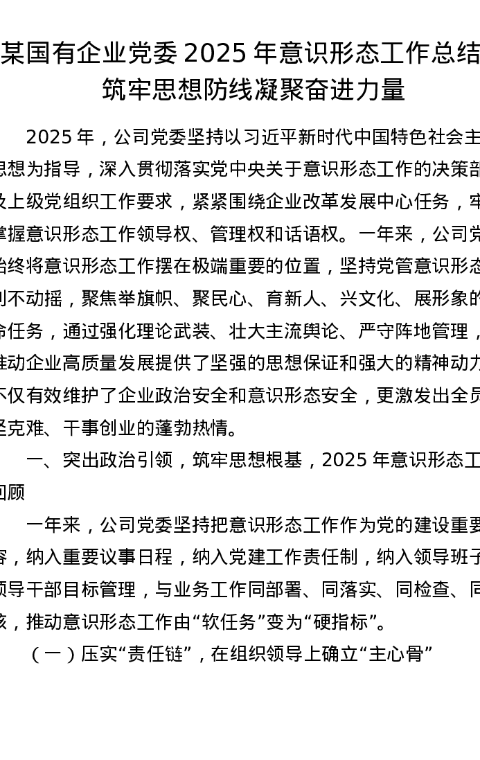 某国有企业党委2025年意识形态工作总结:筑牢思想防线 凝聚奋进力量