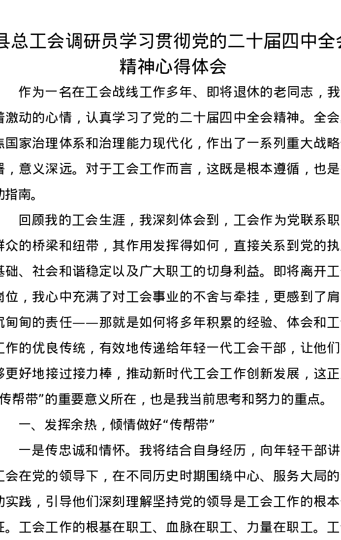 县总工会调研员学习贯彻党的二十届四中全会精神心得体会