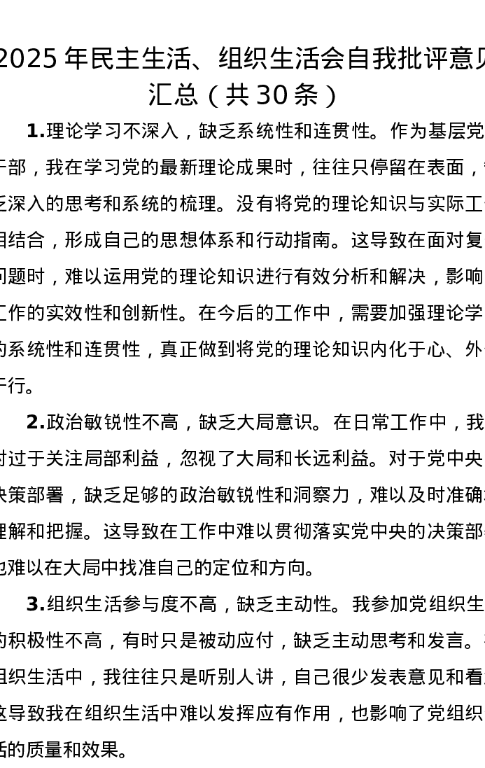 2025年民主生活、组织xxx自我批评意见汇总(共30条)