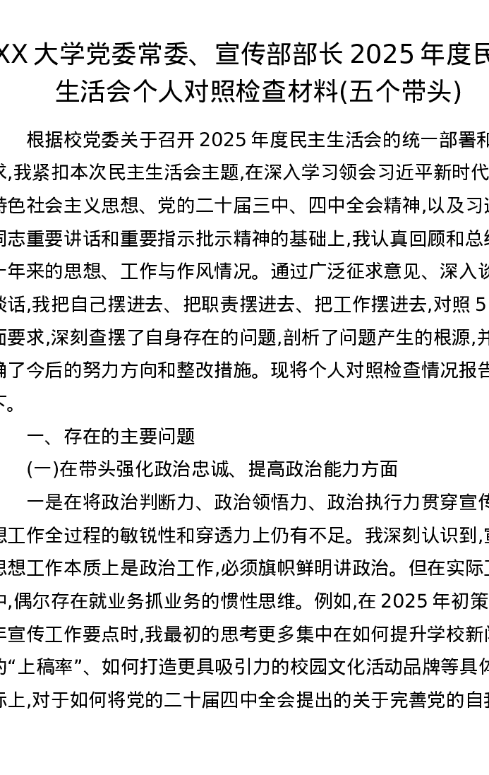 XX大学党委常委、宣传部部长2025年度五个带头xxxxx个人对照检查材料