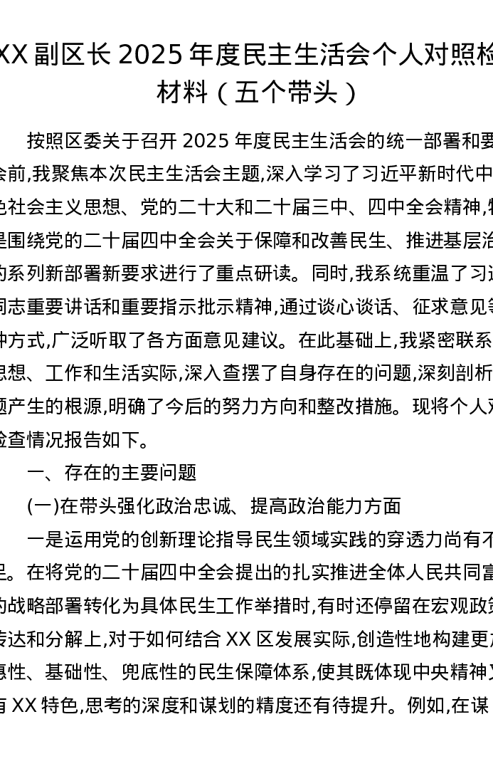 XX副区长2025年度五个带头xxxxx个人对照检查材料