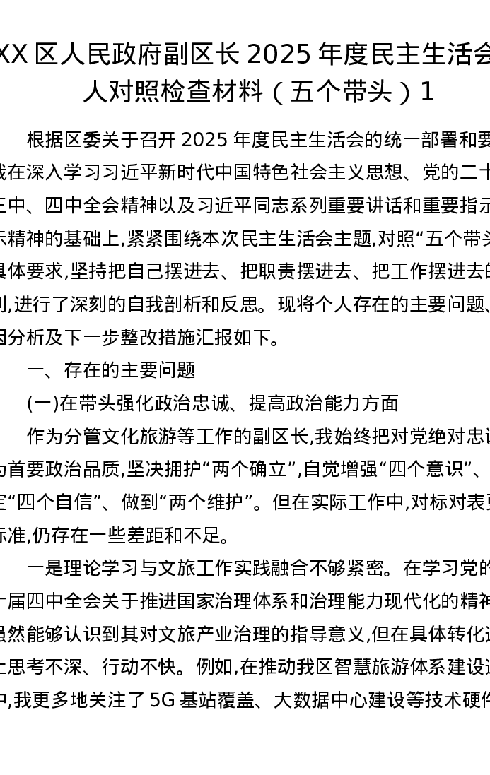 XX区人民政府副区长2025年度五个带头xxxxx个人对照检查材料1