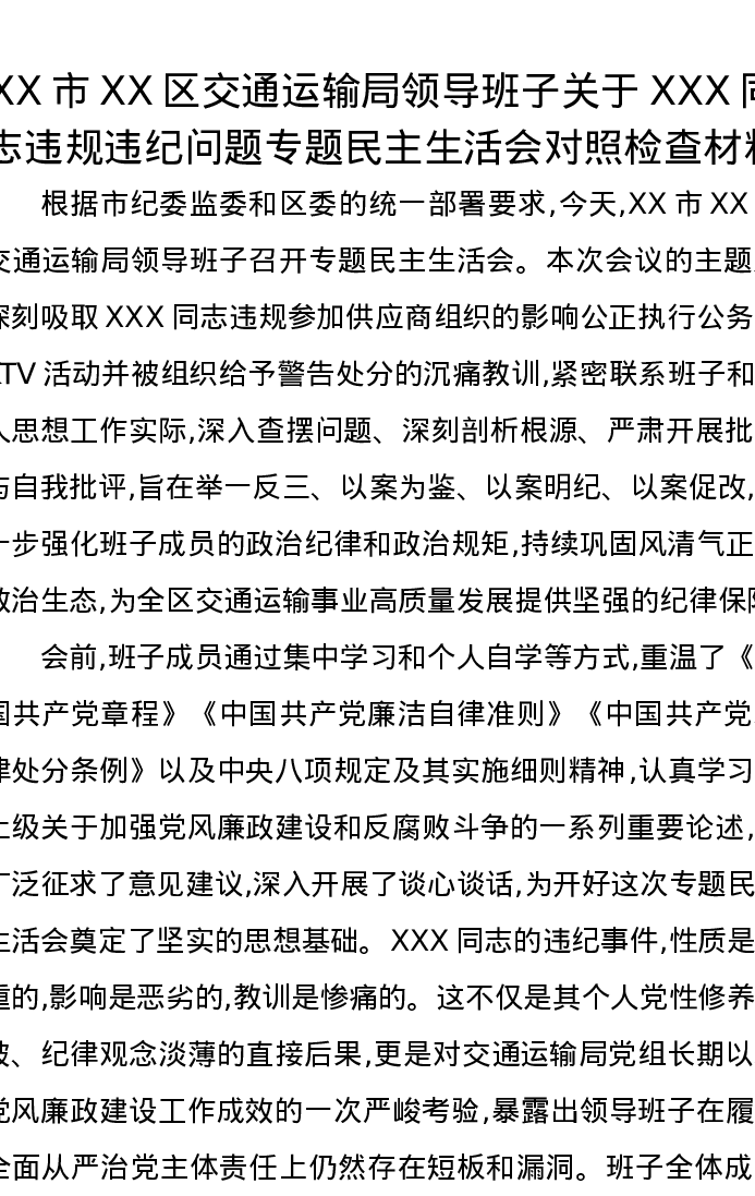 XX市XX区交通运输局领导班子关于XXX同志违规违纪问题专题xxxxx对照检查材料