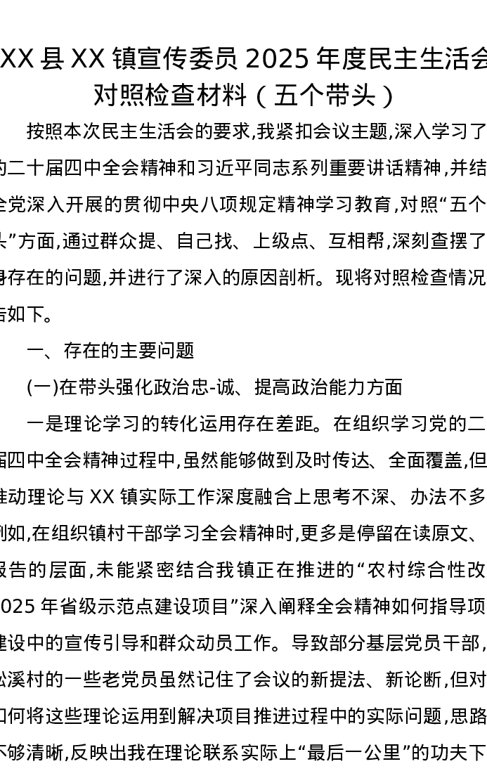 XX县XX镇宣传委员2025年度xxxxx对照检查材料(五个带头)