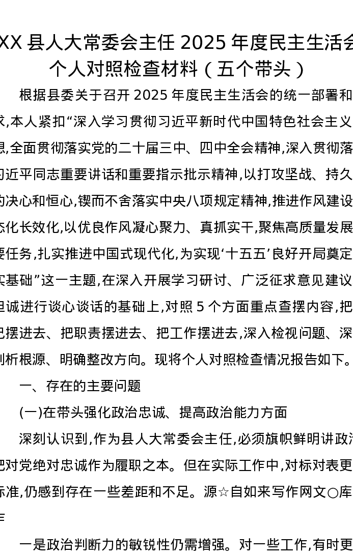 XX县人大常委会主任2025年度xxxxx个人对照检查材料(五个带头)