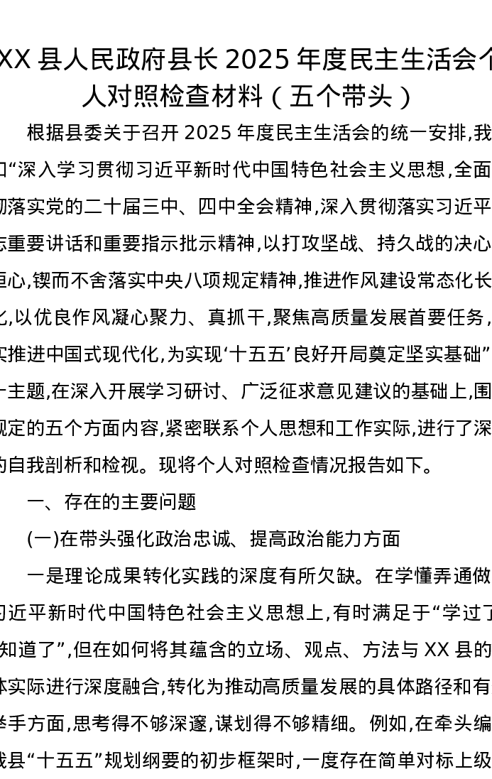 XX县人民政府县长2025年度xxxxx个人对照检查材料(五个带头)