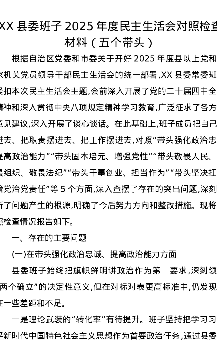 XX县委班子2025年度xxxxx对照检查材料(五个带头)