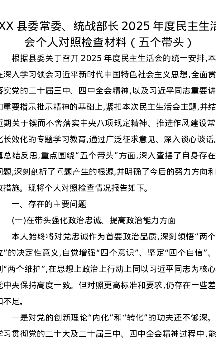 XX县委常委、统战部长2025年度xxxxx个人对照检查材料(五个带头)