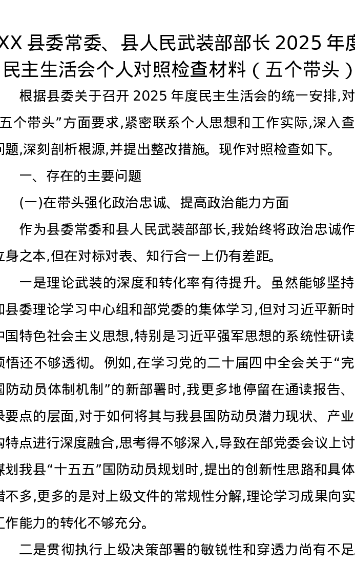XX县委常委、县人民武装部部长2025年度xxxxx个人对照检查材料(五个带头)