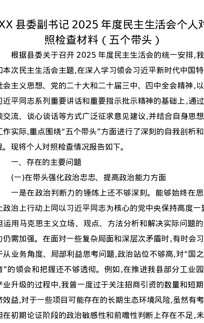 XX县委副书记2025年度xxxxx个人对照检查材料(五个带头)
