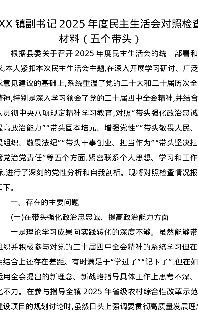 XX镇副书记2025年度xxxxx对照检查材料(五个带头)