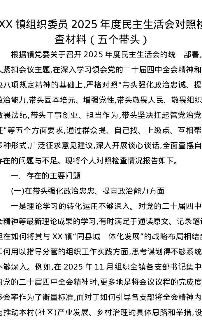 XX镇组织委员2025年度xxxxx对照检查材料(五个带头)