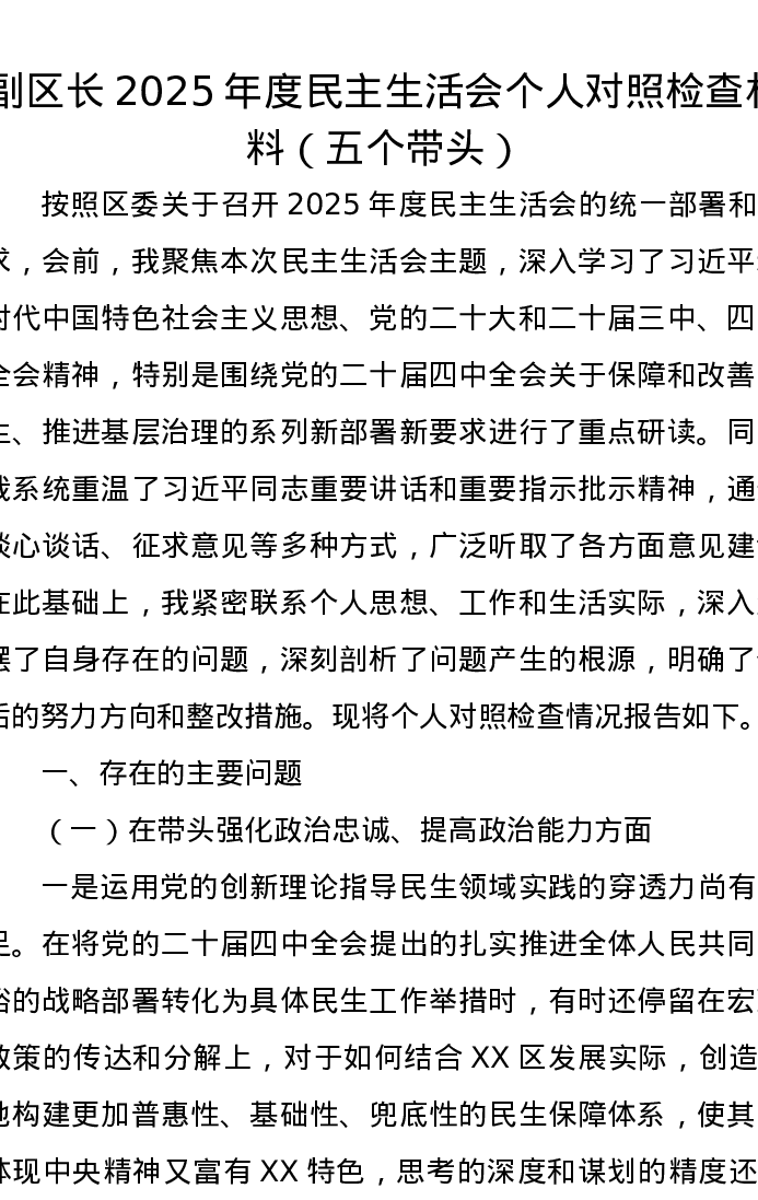 副区长2025年度xxxxx个人对照检查材料(五个带头)
