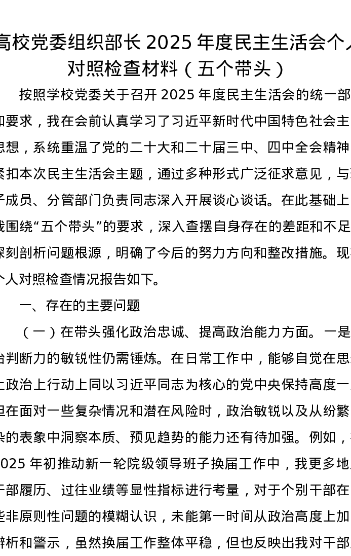 高校党委组织部长2025年度xxxxx个人对照检查材料(五个带头)