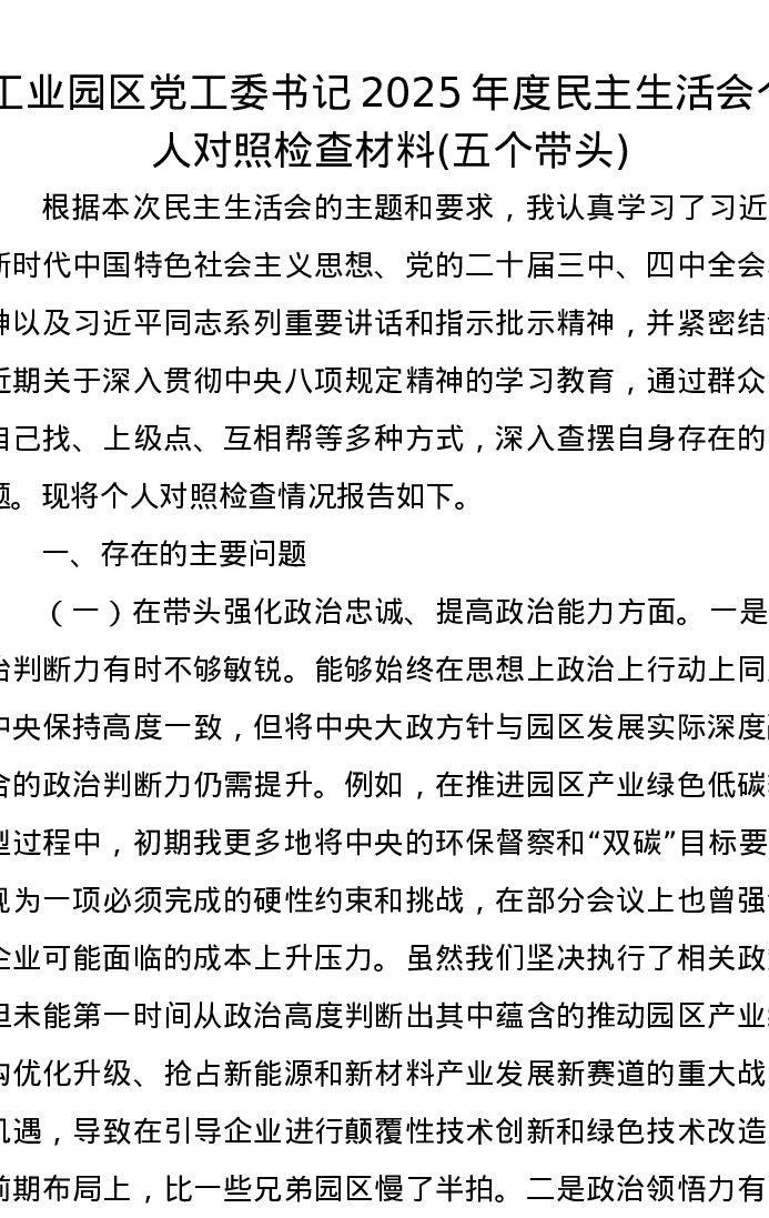 工业园区党工委书记2025年度xxxxx个人对照检查材料(五个带头)