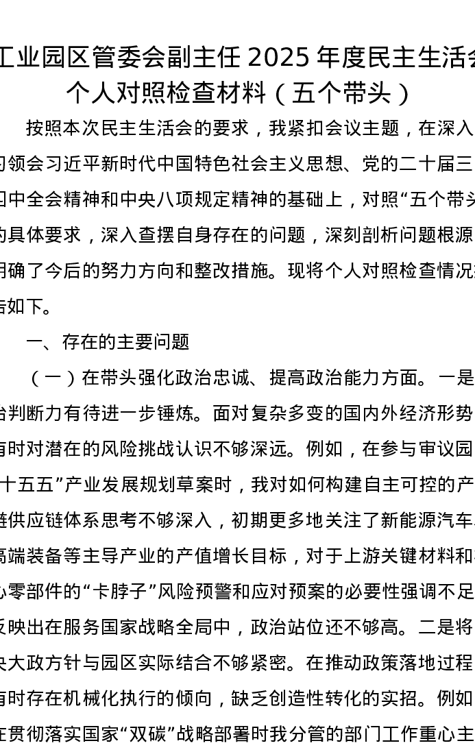 工业园区管委会副主任2025年度xxxxx个人对照检查材料(五个带头)
