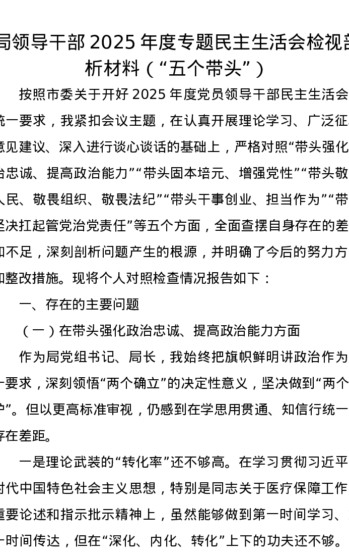 局领导干部2025年度专题xxxxx检视剖析材料(五个带头)