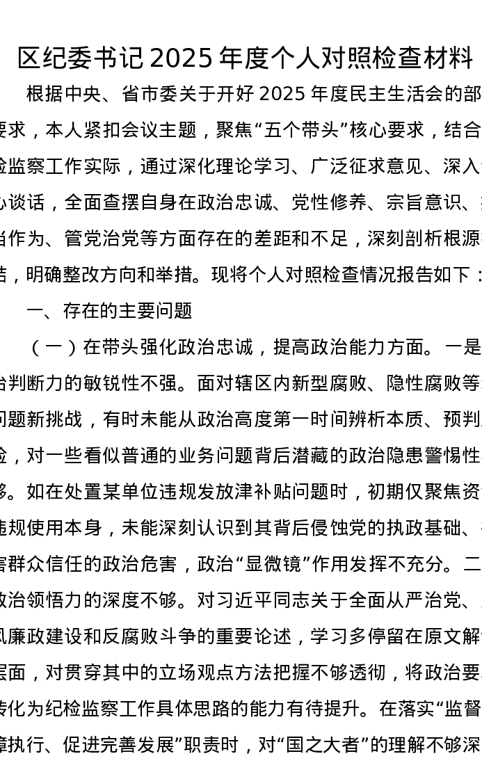 区纪委书记2025年度xxxxx个人对照检查材料(五个带头)