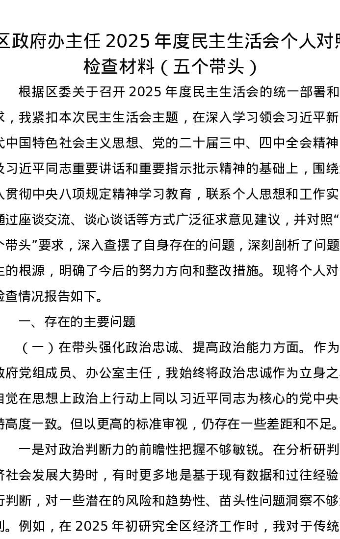 区政府办主任2025年度xxxxx个人对照检查材料(五个带头)