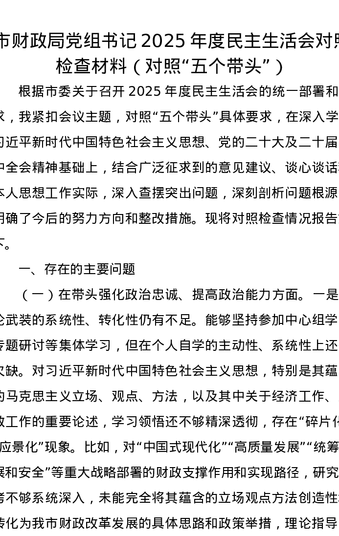 市财政局党组书记2025年度五个带头xxxxx对照检查材料