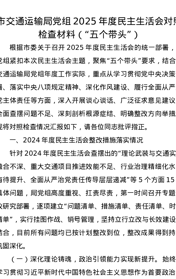市交通运输局党组2025年度xxxxx对照检查材料(五个带头)