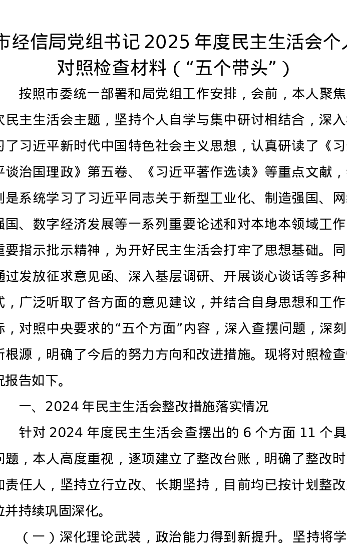 市经信局党组书记2025年度xxxxx个人对照检查材料(五个带头)
