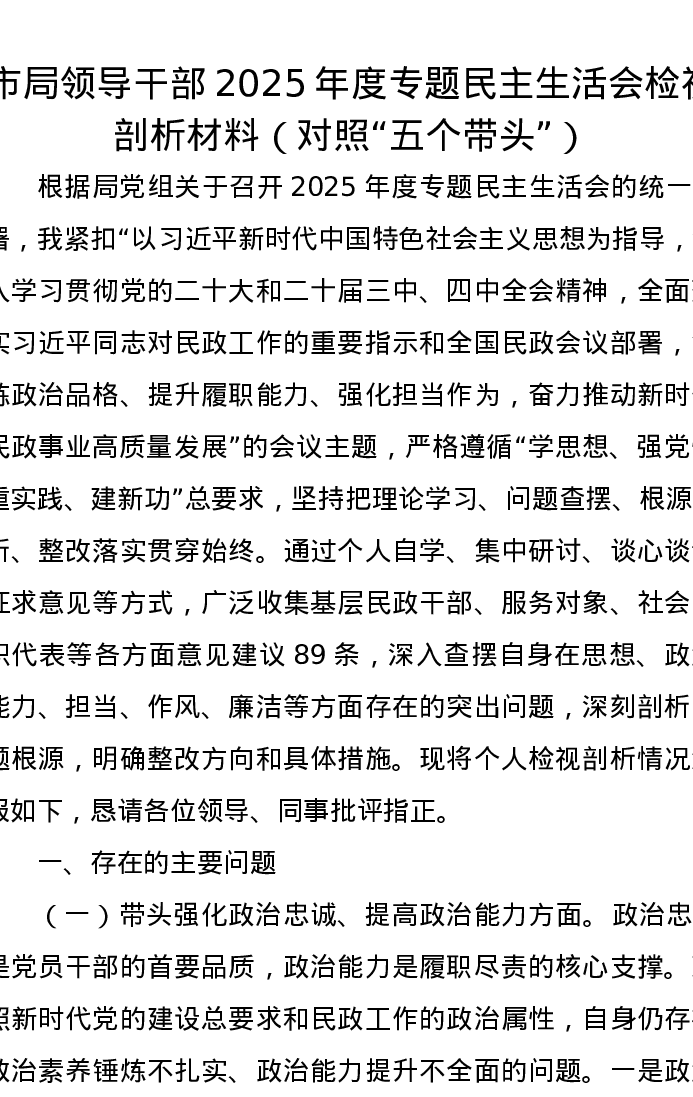 市局领导干部2025年度专题xxxxx检视剖析材料(对照五个带头)