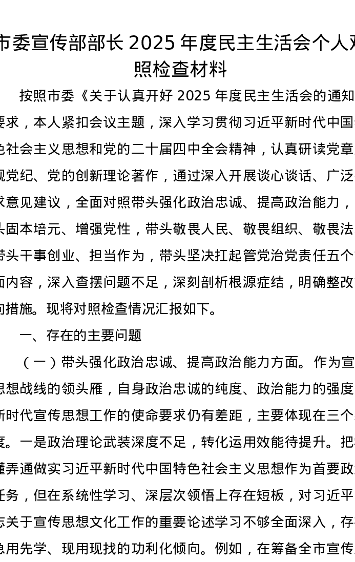 市委宣传部部长2025年度xxxxx个人对照检查材料