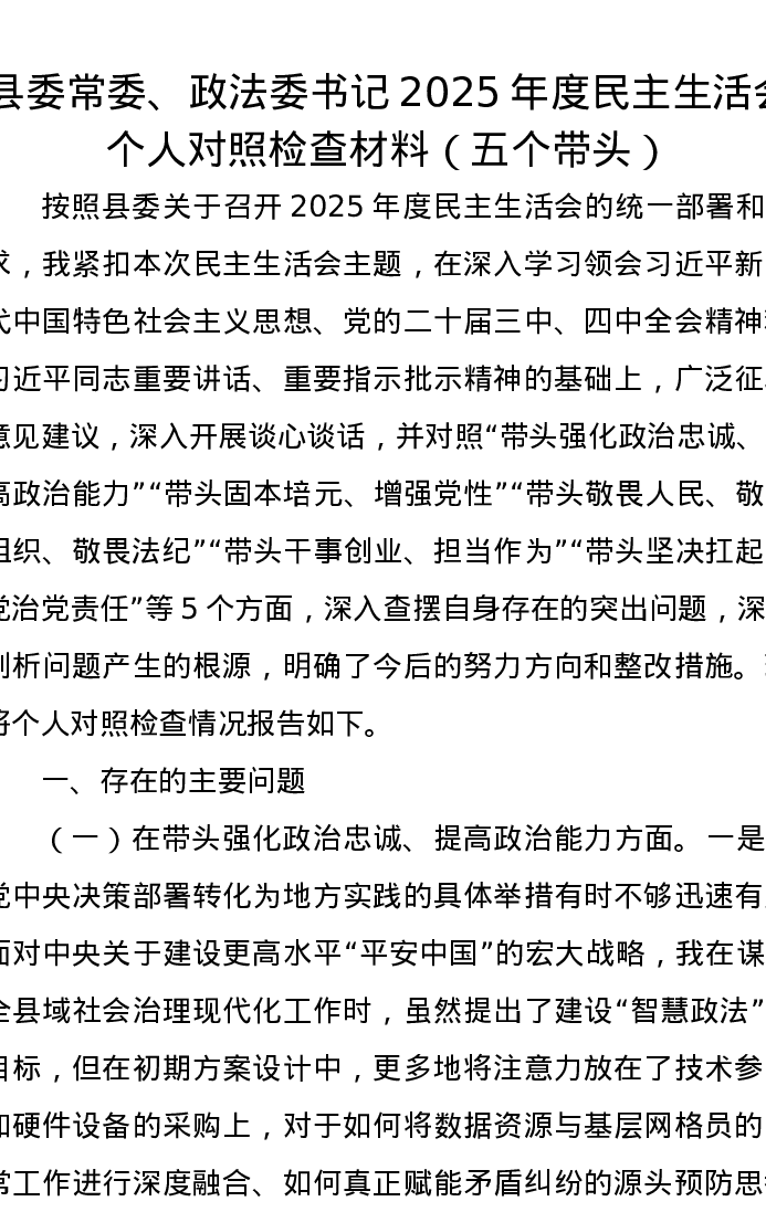 县委常委、政法委书记2025年度xxxxx个人对照检查材料(五个带头)
