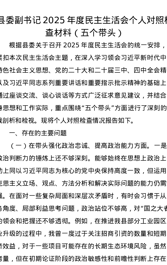 县委副书记2025年度xxxxx个人对照检查材料(五个带头)