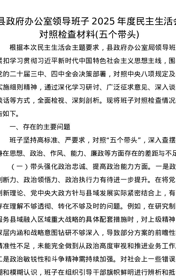 县政府办公室领导班子2025年度xxxxx对照检查材料(五个带头)