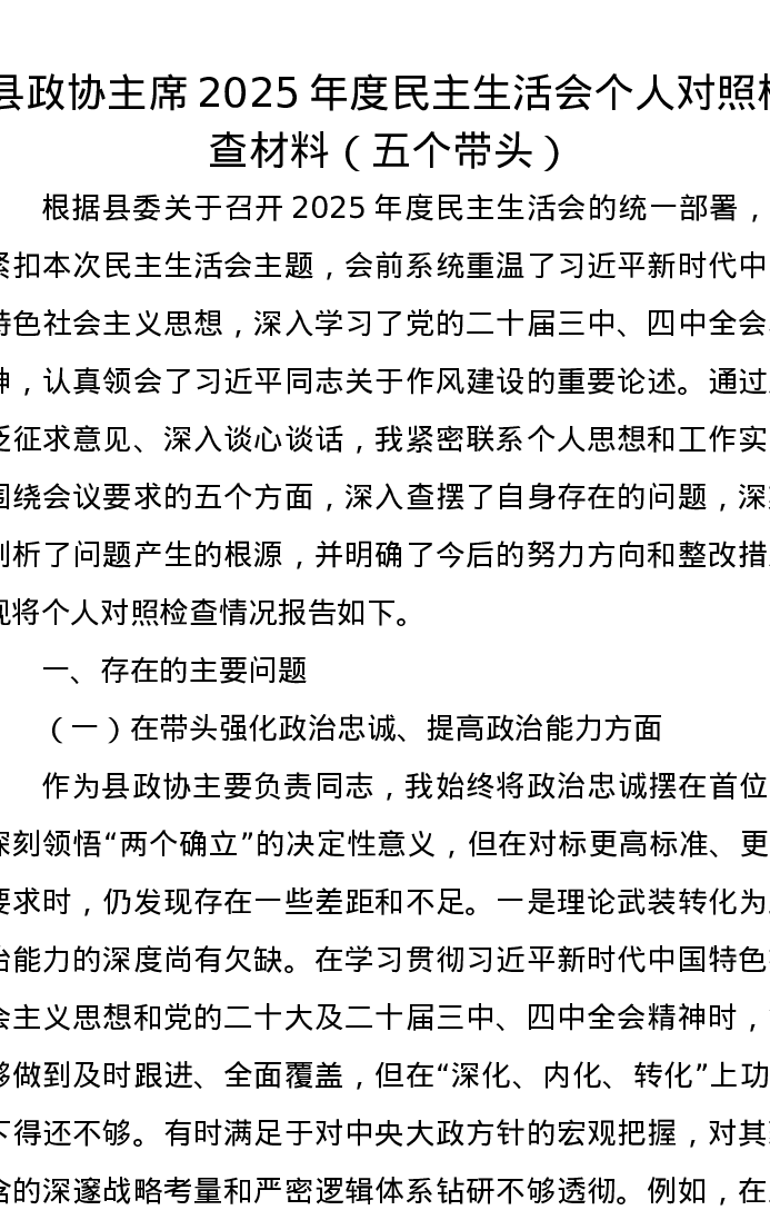 县政协主席2025年度五个带头xxxxx个人对照检查材料