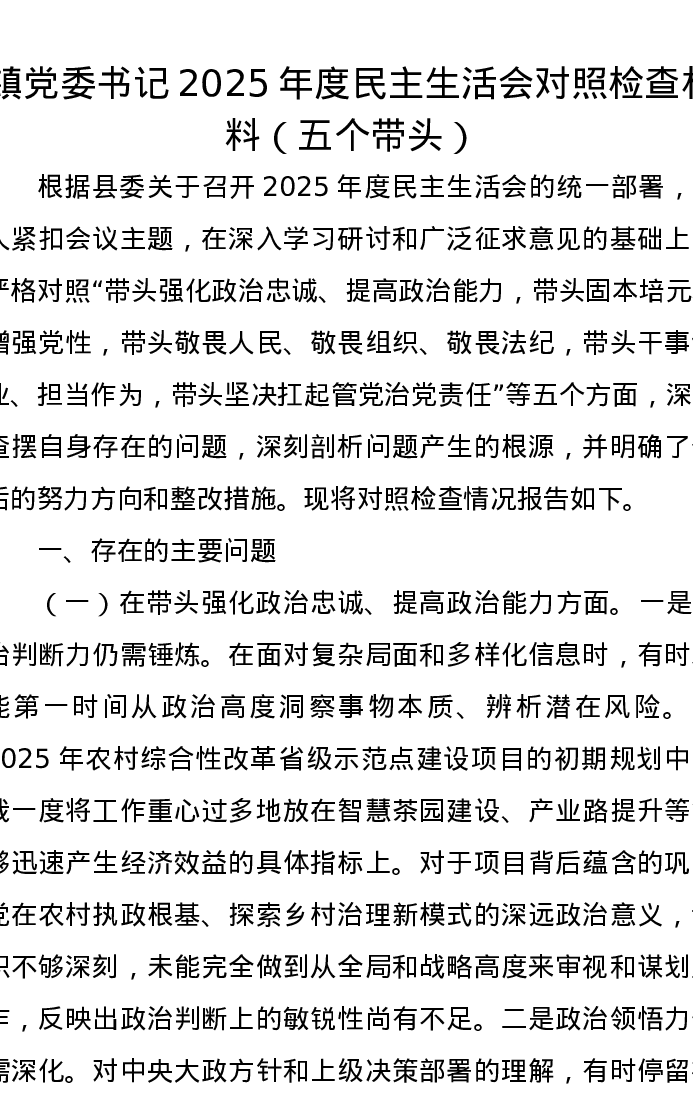 镇党委书记2025年度xxxxx对照检查材料(五个带头)