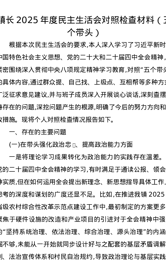 镇长2025年度xxxxx对照检查材料(五个带头)