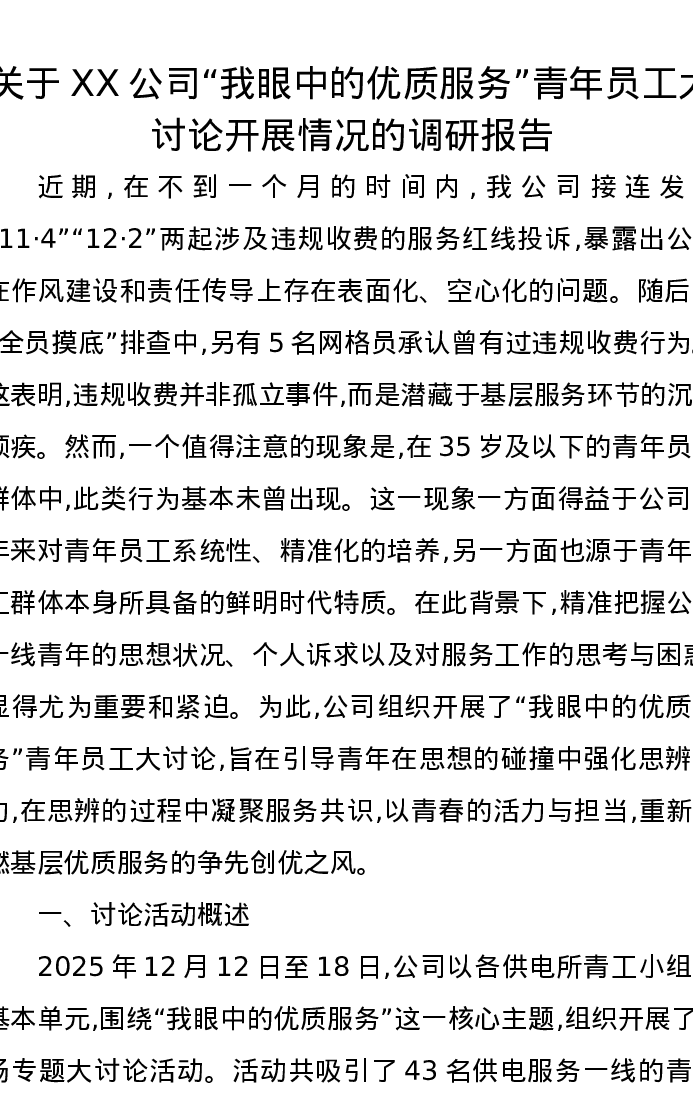 关于XX公司我眼中的优质服务青年员工大讨论开展情况的调研报告