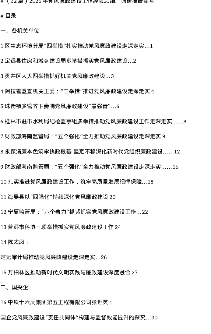 汇编:2025年党风廉政建设工作经验总结、调研报告32篇