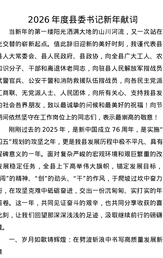 2026年度县委书记新年献词
