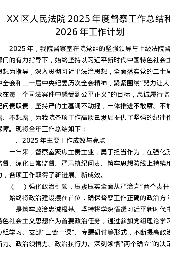 XX区人民法院2025年度督察工作总结和2026年工作计划