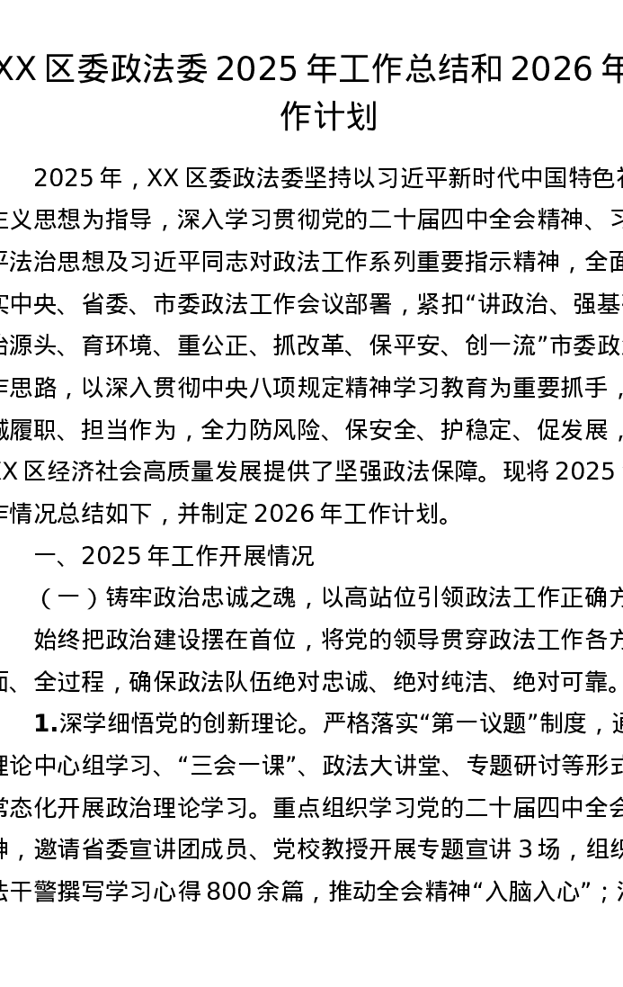 XX区委政法委2025年工作总结和2026年工作计划