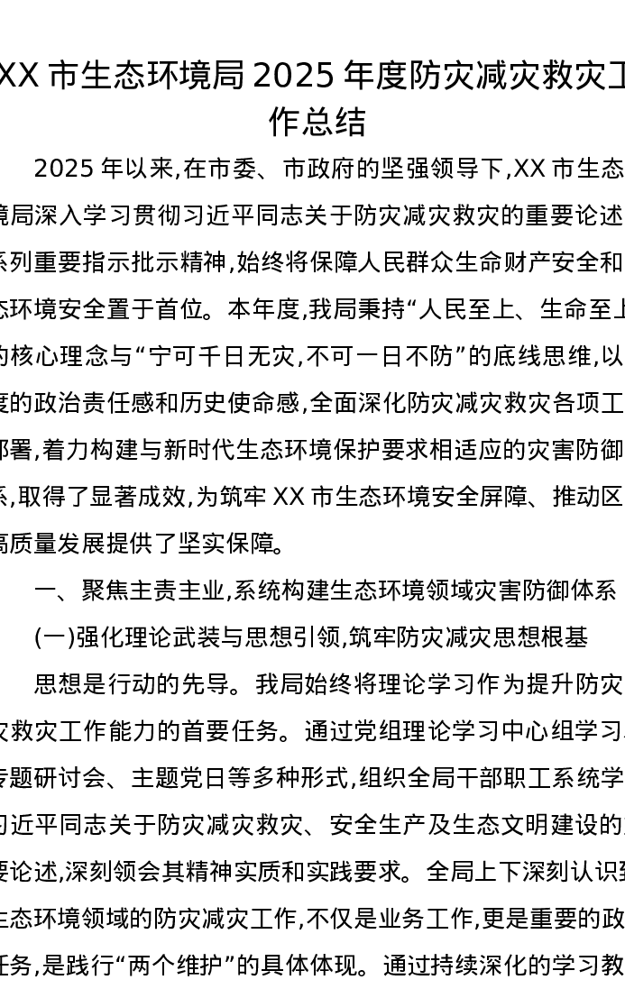 XX市生态环境局2025年度防灾减灾救灾工作总结